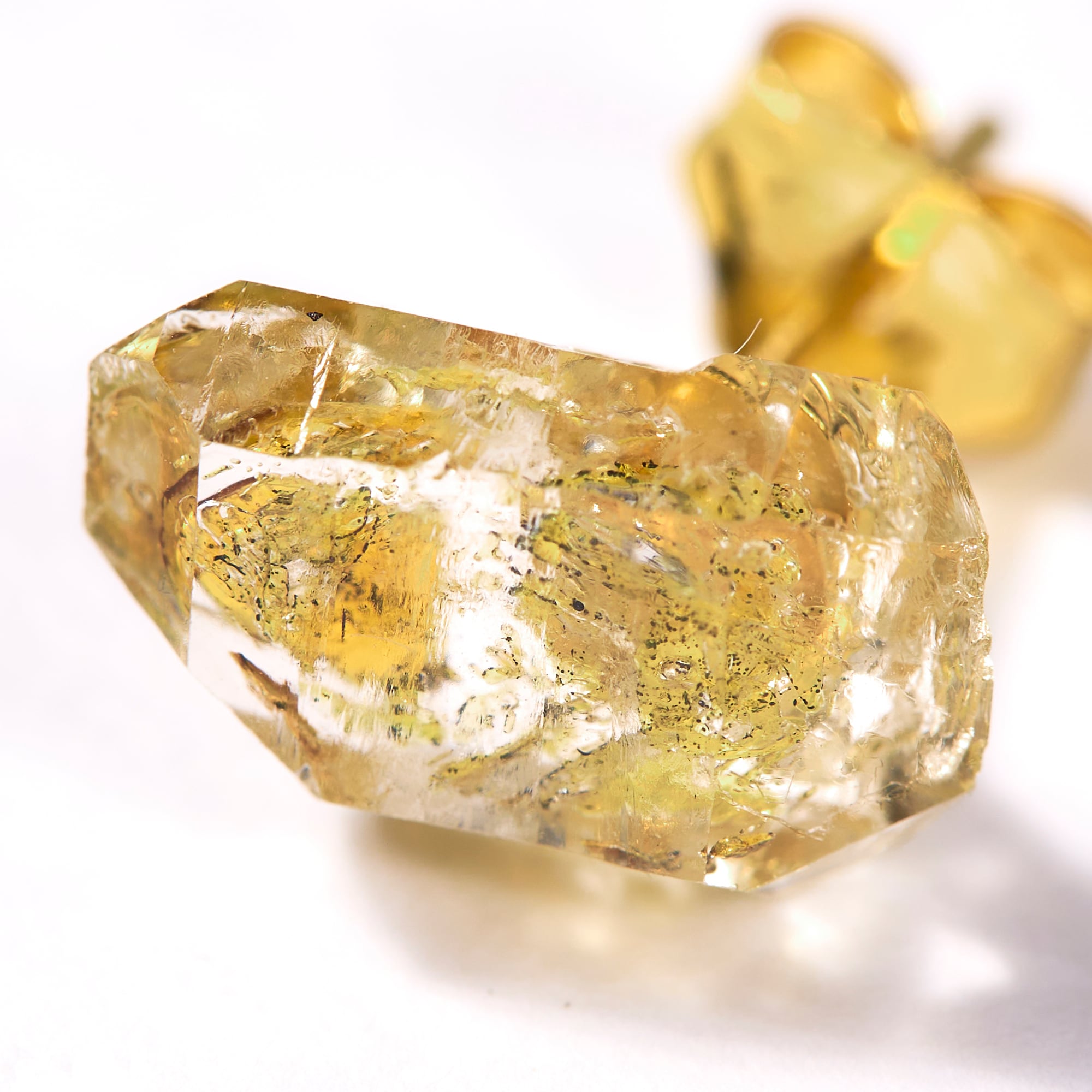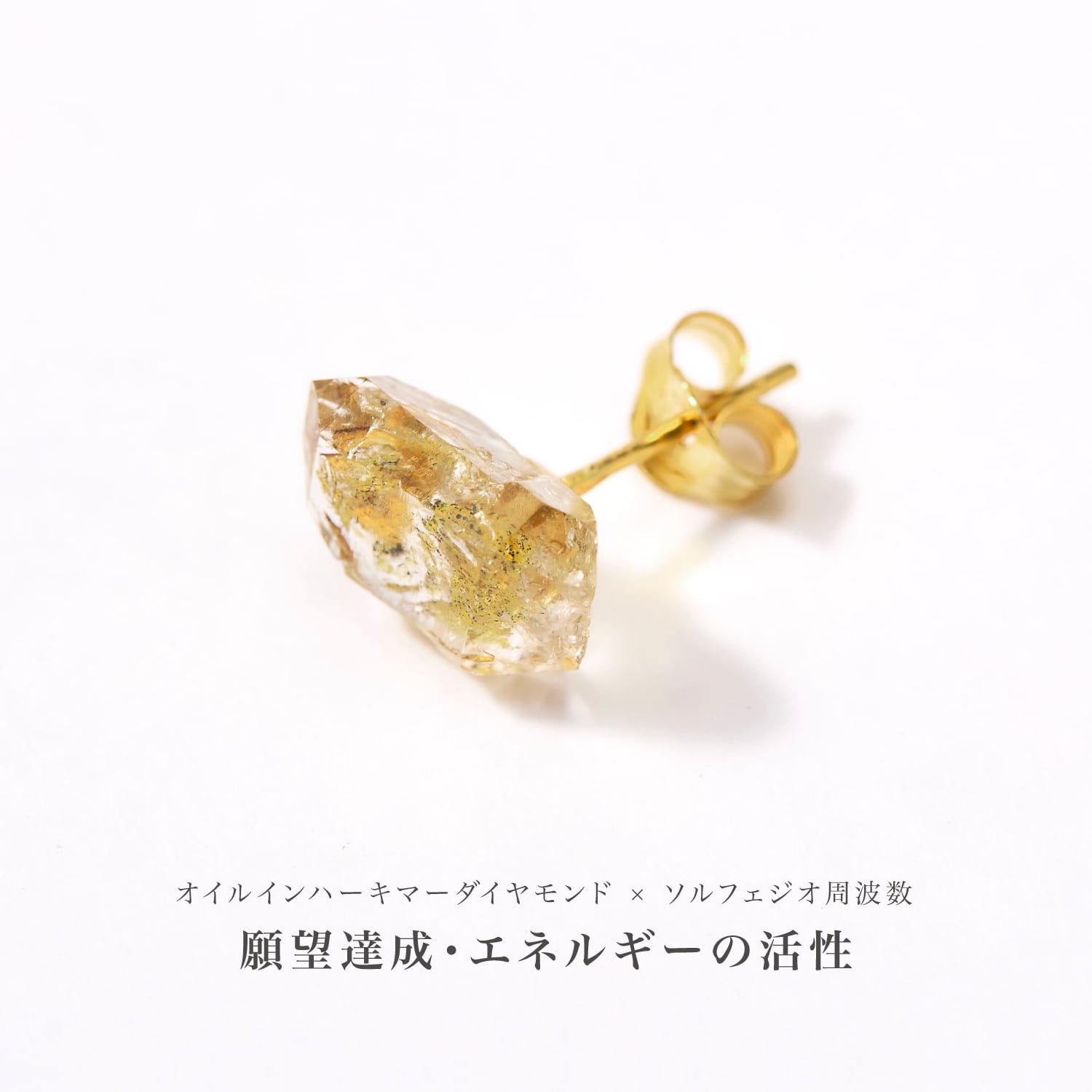太古のオイル(石油)が内包され非常に強い地球のパワーを秘めているオイルインハーキマーダイヤモンドに「奇跡の周波数」ソルフェジオ周波数528Hzを注音した特別な波動注音ピアスです。