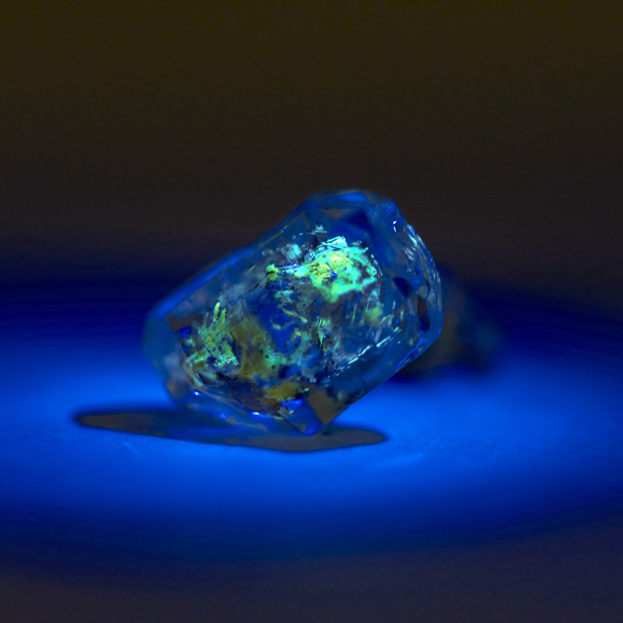 黄色に見えているオイルはブラックライトなどの紫外線により幻想的な青白い発光を呈します。